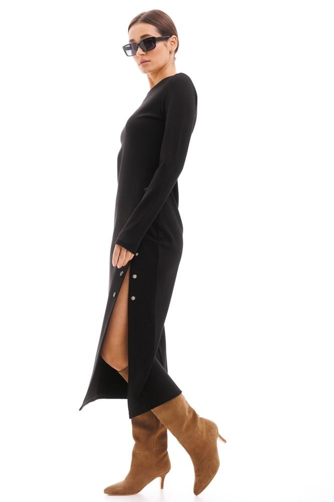 Високий розріз, який спереду під кутом від лівого бічного шва вниз, зверху застібається на кнопки, що дає змогу змінювати акценти в модному образі. Рукави в платті довгі, горловина кругла, краї низу прямі. Ззаду вгорі виріб застібається на довгу потаємну блискавку.