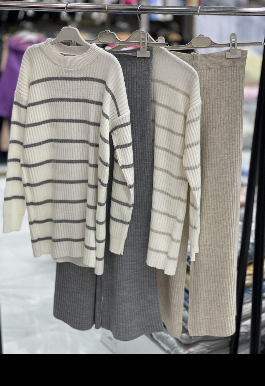 Бежевий теплий костюм на дівчинку кофта в смужку з довгим рукавом і штани кльош