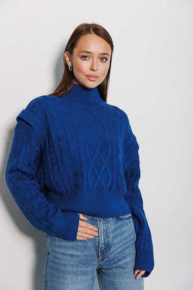 Ця модель привертає увагу комбінацією в'язаних візерунків у ромби та коси, а також в'язаними вставками "крильцями" спереду та ззаду, які схожі на краї надетої поверх жилетки. Плечі у виробі подовжені, прямий низ і довгі рукави закінчуються високими манжетами з тонкою гумкою на краях. Комір-стійка на круглій горловині на краях також обшитий тонкою гумкою.