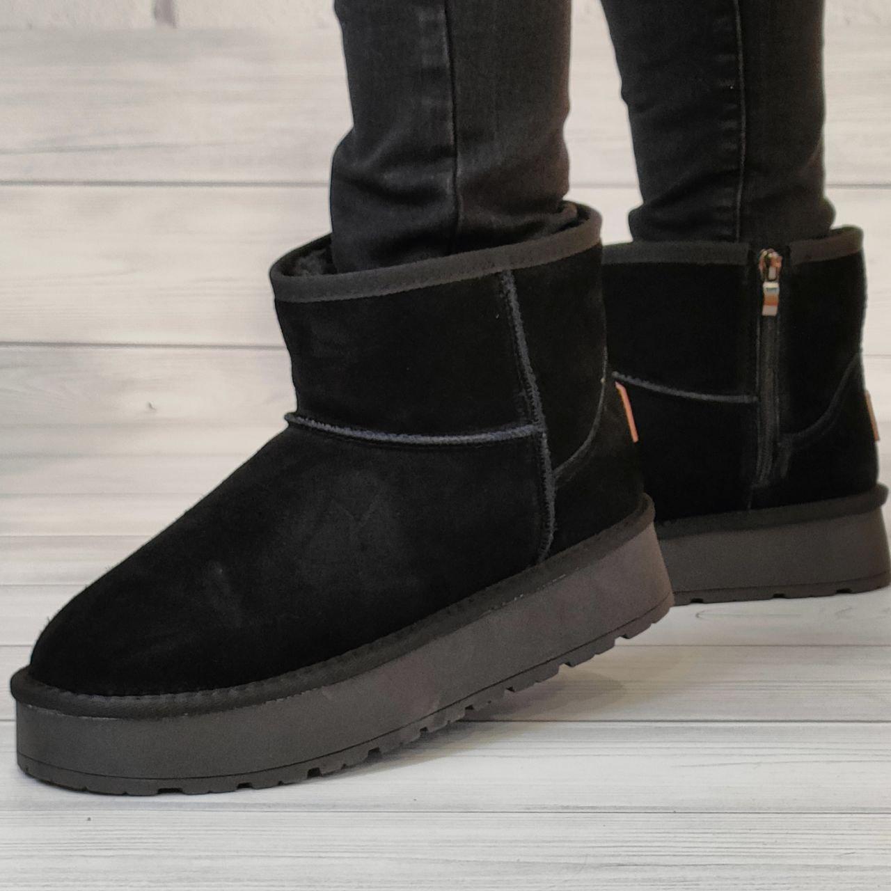 Жіночі зимові теплі замшеві короткі чорні уги на товстій підошві