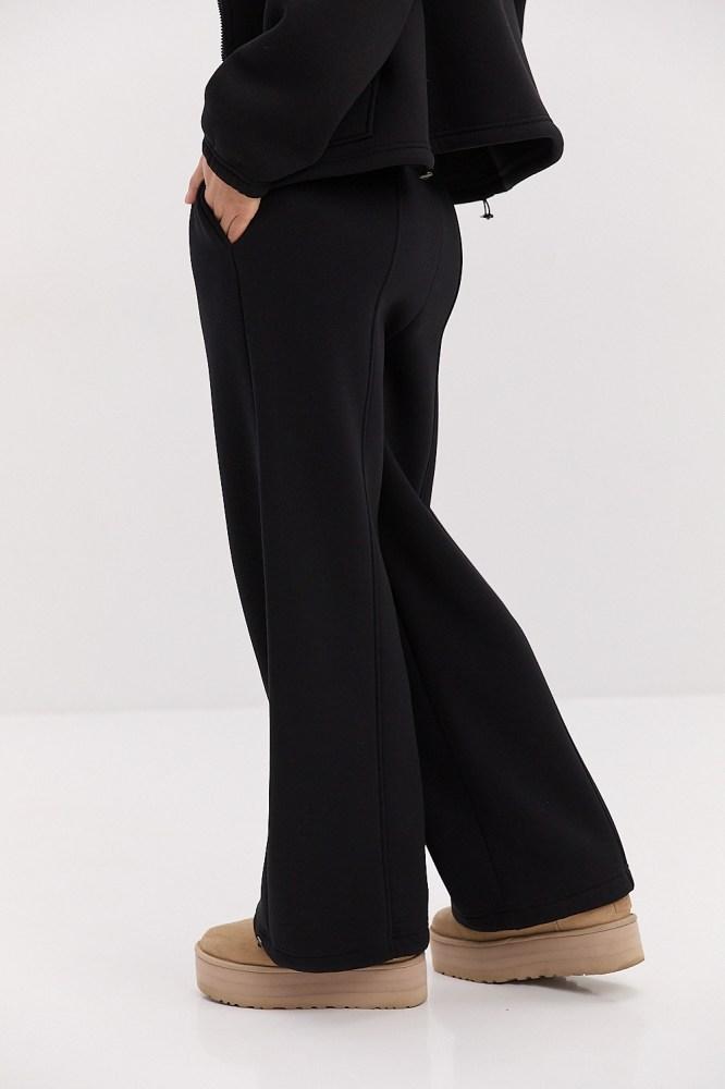 Краї низу у виробі прямі, ушивний пояс йде із широкою гумкою та доповнений шнурком. Спереду розташовані кишені з косою лінією входу.
