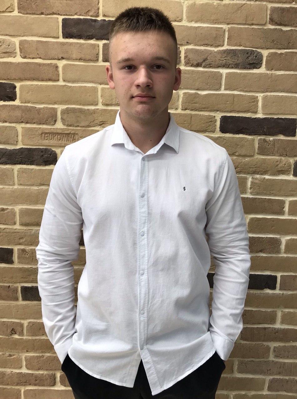 Чоловіча однотонна біла сорочка з коміром із нашивкою