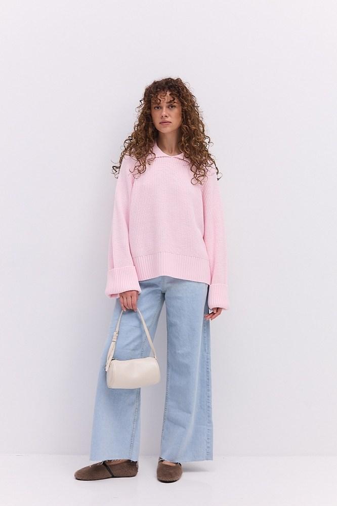Модель виготовлена з машинного в'язання в широкий рубчик із високими манжетами з гумкою внизу виробу та на широких рукавах. Кругла горловина доповнена відкладним коміром у стилі поло, без застібок.